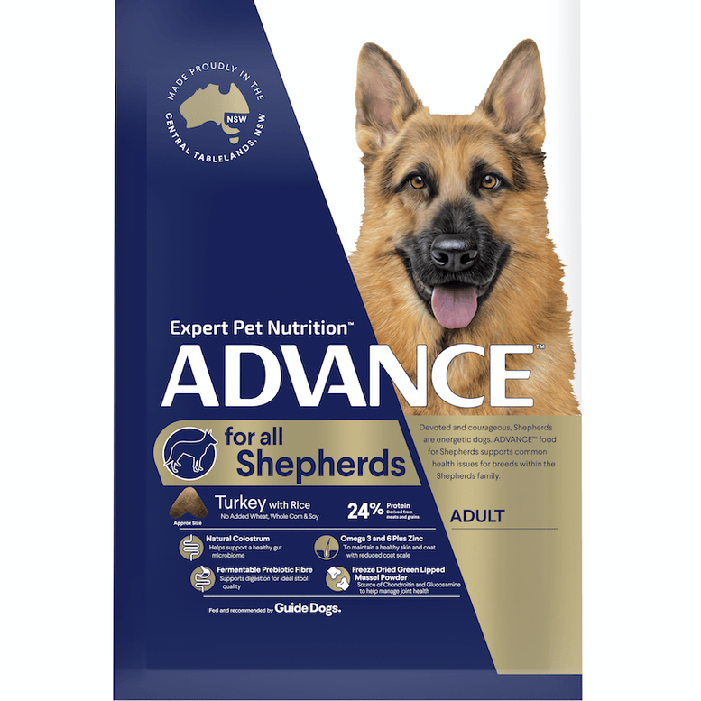 This super premium, Australian-made, dry dog food is complete and balanced to support the unique nutritional requirements of Shepherds and other large breed dogs. High quality turkey is included as a novel protein source and combined with highly digestible ingredients to support optimal digestion and small, firmer stools. Functional ingredients such as Green Lipped Mussel have been clinically proven and added to help manage joint disease, a condition that large breed dogs are particularly prone to. This recipe also contains enhanced levels of zinc and linoleic acid to nourish the skin and coat, while the unique kibble size and shape reduces the accumulation of tartar and plaque accumulation due to the mechanical abrasion of the tooth surface.