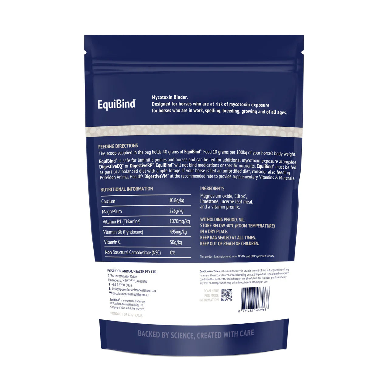 EquiBind is an evidence-based and vet-recommended dual action mycotoxin binder designed to support horses exposed to mycotoxins in stored feed or pasture. The broad-spectrum binding formula binds 2 types of toxins but does not bind Vitamins and Minerals. EquiBind includes magnesium, calcium, antioxidant Vitamin C, and B-group vitamins to maintain digestive function, and support your horse against feed contaminants.