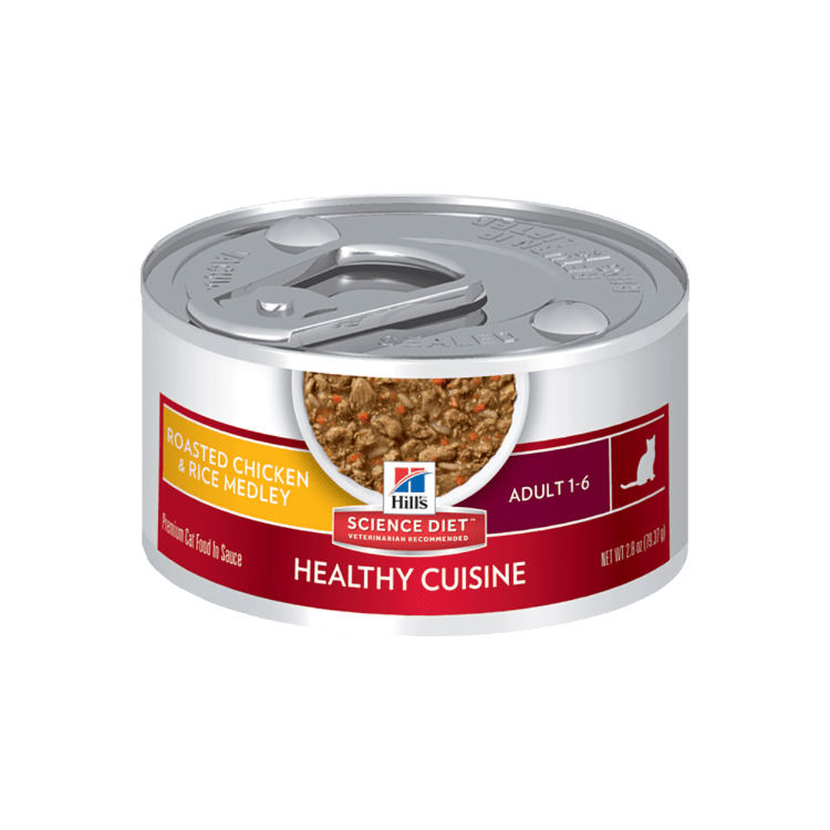 Hill's® Science Diet® Adult Healthy Cuisine Roasted Chicken & Rice Medley combines the delicious flavors of roasted chicken and rice in a mouthwatering sauce --- canned cat food with the perfect balance of taste and nutrition for your cat.