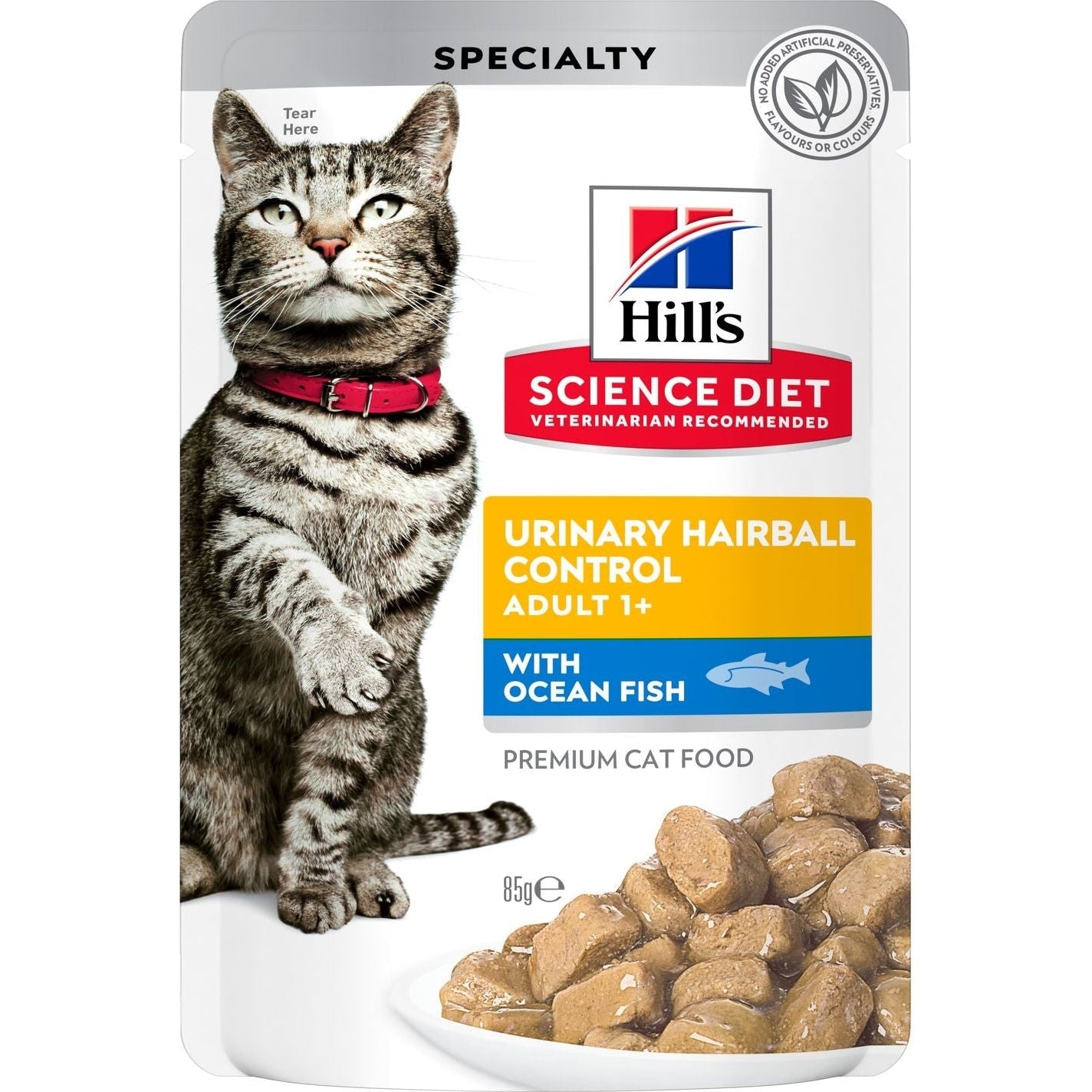 Hill's Science Diet Adult Urinary Hairball Control Ocean Fish wet cat food provides precisely balanced nutrition to help support the health of the whole urinary system while also helping to avoid hairballs.