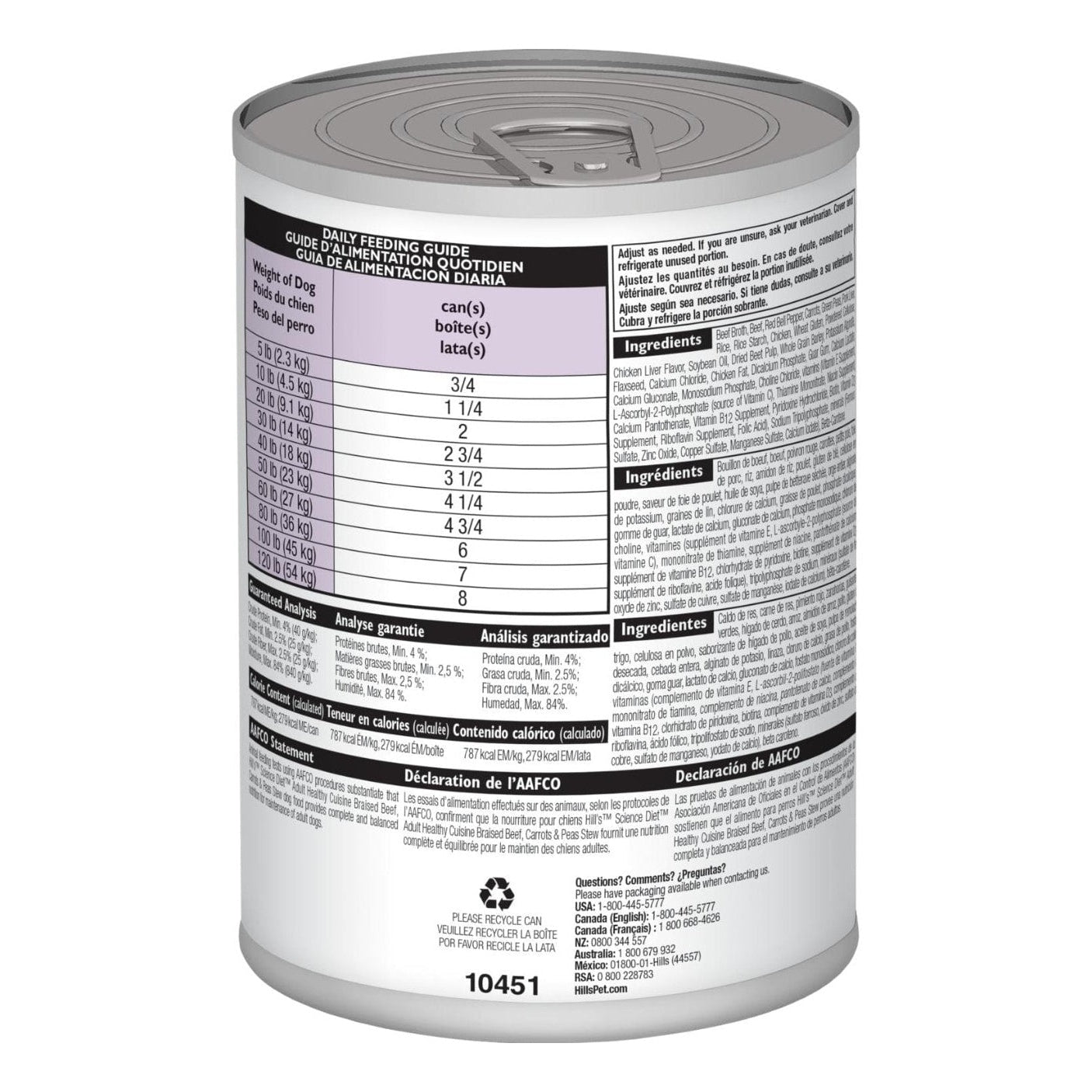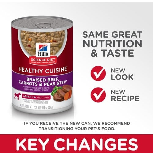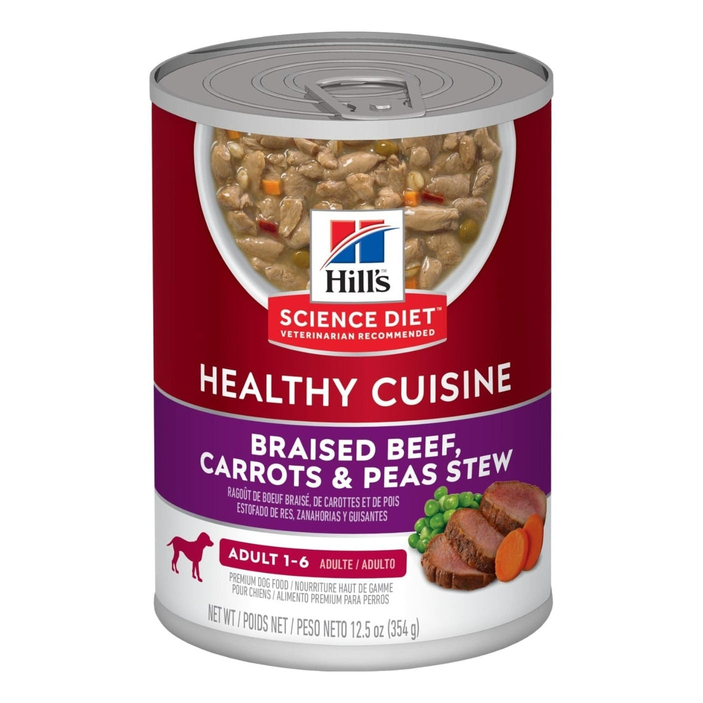 Hill's® Science Diet® Adult Healthy Cuisine Braised Beef, Carrots & Peas Stew combines the delicious flavors of braised beef and tender vegetables in a succulent stew - canned dog food with the perfect balance of taste and nutrition for your dog.