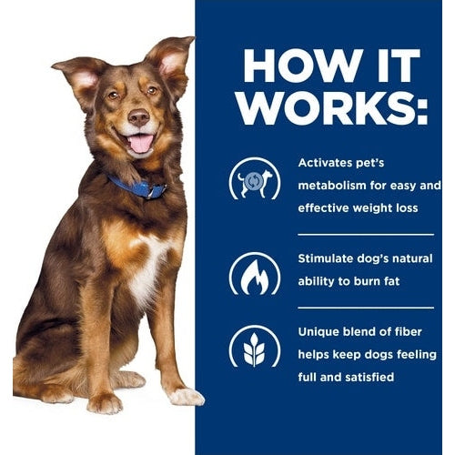 Hill's nutritionists & veterinarians developed Prescription Diet Metabolic clinical nutrition specially formulated to help dogs lose weight and keep the lost weight off naturally by activating their unique metabolism. This food stimulates dog's natural ability to burn fat and keep them playful & active. Its unique blend of fiber helps keep dogs feeling full and reduces food hunger between meals.