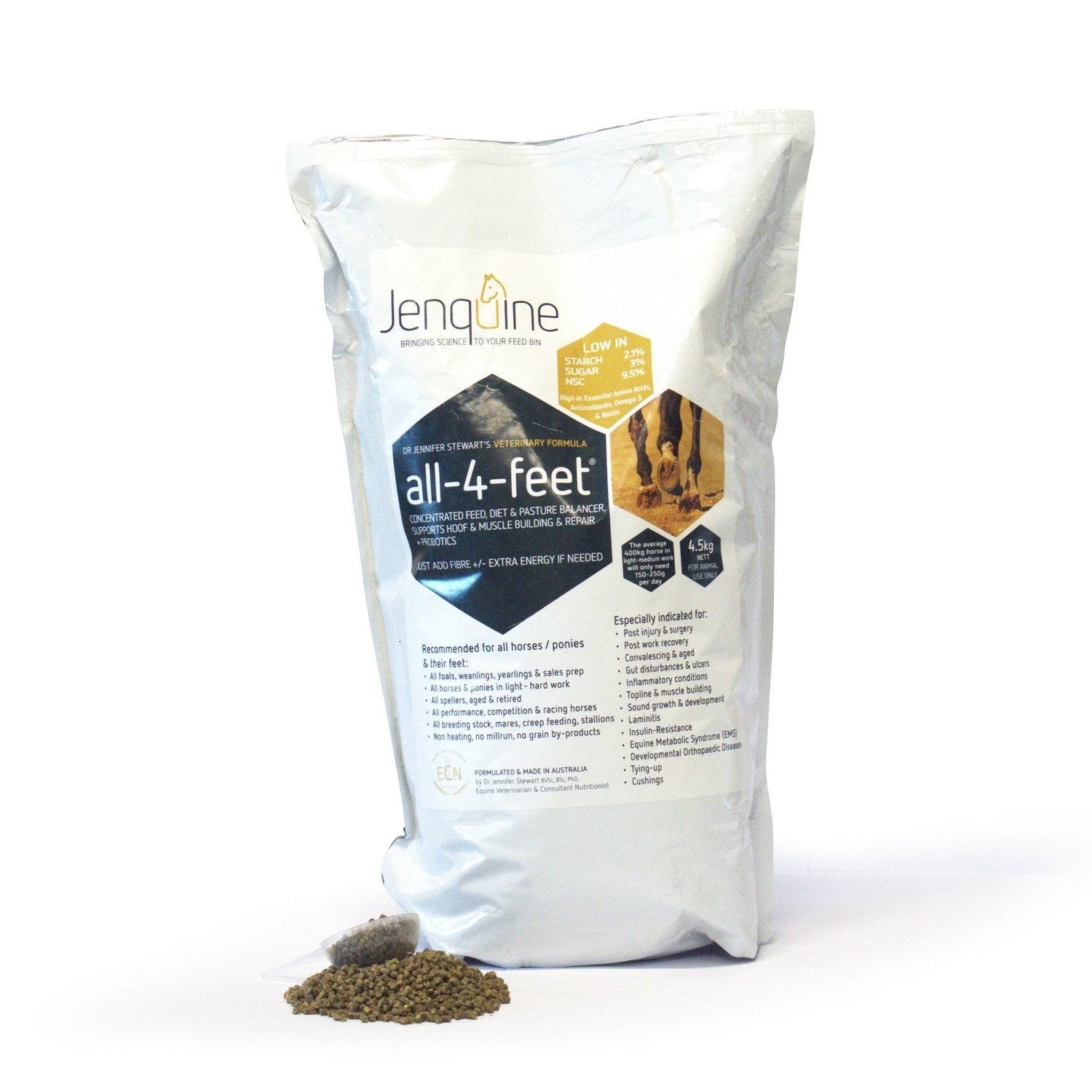 Jenquine all-4-feet surpasses and exceeds the stringent criteria set by The Laminitis Trust AND removes the need to feed multiple supplements (except on veterinary advice) & can be added to or replace manufactured feeds