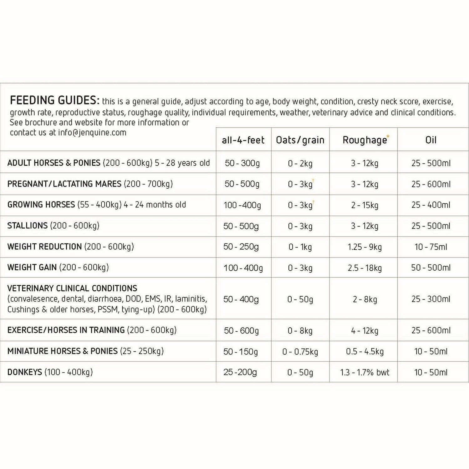 For a 400kg horse in light to medium work, feed 150g-250g of Jenquine All 4 Feet daily. Add fibre and extra energy if needed.
