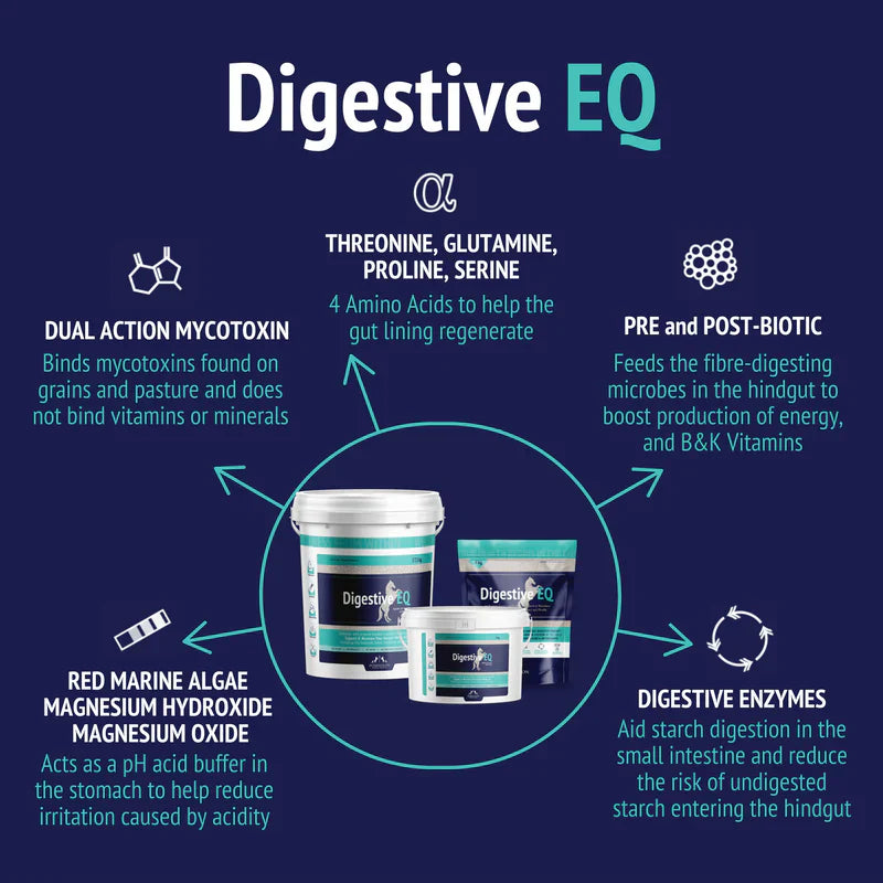 DigestiveEQ is a complete fore- and hindgut supplement for horses, supporting digestion, nutrient absorption, gut health, and immunity. With dual-action buffering, enzymes, postbiotics, prebiotics, amino acids, and mycotoxin binders, it promotes full intestinal health. Ideal for pleasure or lightly worked horses. Always consult your vet for tailored advice.