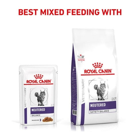 Royal Canin Veterinary Diet Feline Neutered Balance Wet Cat Food - 12 x 85g pouches (CF69) is a complete feed for neutered adult cats or with a tendency to gain weight - from neutering up to 7 years old. Neutering has a large effect on hormone levels in cats and while these changes have a positive outcome, there is one important thing that all cat owners should know. 2 days after castration, changing hormones can cause a cat's energy needs to decrease by 30%, but also increases their appetite by 20%. This can lead to significant weight gain. An easy solution is to feed your neutered cat a diet that contains the correct ingredients.
