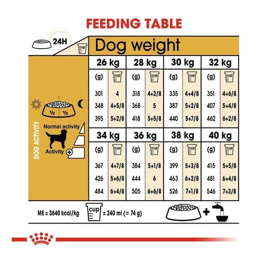 A determined athlete, the Labrador Retriever gives all it's got when it comes to exercise. Its solid body and strong bones means that your dog needs nutrients that help to maintain its healthy joints.Through the inclusion of specific nutrients, including omega-3 fatty acids EPA & DHA, ROYAL CANIN® Labrador Retriever Adult helps support to healthy bones and joints.